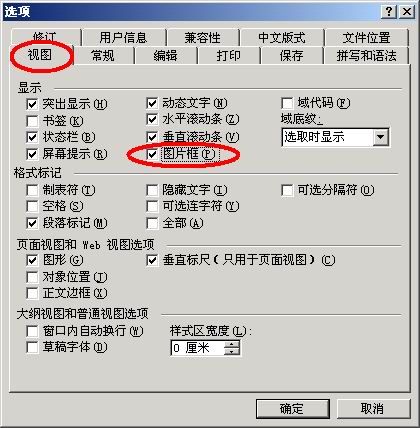 解决:开启图文并茂的Word文件,按下“工具”→“选项”,在“选项”对话框中,切换至“视图”活页卷标下,在“显示”选项中,勾选“图片框”(图)。