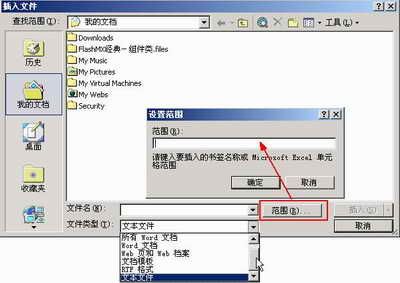 选择“插入”→“文件”,会弹出“插入文件”对话框,插入的文件类型可以有好几种:“Word文档、Web页和Web档案、文档模版、RTF格式、文本文件”,我们大家可以自行选择,而且单击“范围”按钮,还可以用插入文档中的书签名称和Excle单元格来限制插入文件的范围。
