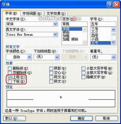 (2) 选中需要做上标的文字,然后点击右键或者选择“格式”菜单中“字体”,在“字体”对话框的“效果”选项中,勾选所需的多选框,如下图所示。