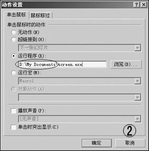 如果设置了单击某个对象时就运行外部程序(如Flash动画),发布课件时,使用“打包”命令也无济于事。怎么办呢?首先将D:\My Documents\screen.exe(需要运行的程序的完整路径)拷贝到PowerPoint演示文稿所在目录中,然后在“动作设置”窗口(如图2)中将“运动程序”中的路径删掉,只留下程序文件名“screen.exe”。发布时只需拷贝演示文稿所在目录就可以了。