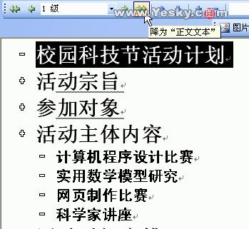 5. 假设我们想把“校园科技节活动计划”段落的级别改为“正文文本”,以便让它作为文档名称,这样在后面的多级标题编号时,它就不会被编号。先选中“校园科技节活动计划”段落,然后单击“大纲”工具栏上的“降为正文文本”按钮即可(图 11)。