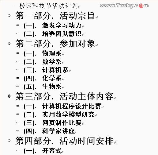 到这里为此,我们初步学习了在大纲视图中建立和调整文档纲目框架的基本方法,练习了各种常见的操作。这部分内容的特点是,只要了解了基本操作原理,其它类似的操作均可仿照进行。当文档的纲目框架建立和修改好后,我们就可以切换到普通或页面视图进行具体内容的填写工作了。