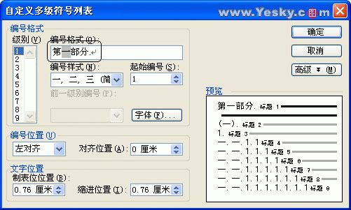 2. 选中“级别”列表框内的“1”,然后选择编号样式为“一、二、三”,在编号格式框内“一”字符之前输入“第”,之后输入“部分。”(图 13)。上面的设置表示文档中一级标题段落按“第X部分”格式编号。