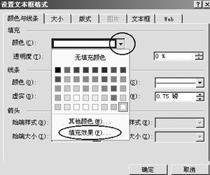 点击菜单命令“插入→文本框→横排”,然后单击鼠标建立一个文本框,选中这个文本框(此时鼠标会变成“十”字形),点击右键,在快捷菜单中选择“设置文本框格式”,打开“设置文本框格式”对话框 。点击“颜色与线条”选项卡中“填充→颜色”下拉菜单,弹出填充颜色设置面板(如图1)。点击“填充效果…”,在弹出的“填充效果”对话框中,选择“图片”选项卡,然后点击其中的“选择图片”按钮,找到事先准备好的图片文件。您还可以在图1所示的“设置文本框格式”对话框中,设置文本框的颜色、线条宽度、边框线的样式等,还可以调整图片的透明度,制作出类似于水印的效果。此外,在“图片”的选项卡中,您还可以调整图片的亮度和对比度,对图片进行简单的粗加工。