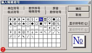 执行“插入→符号”命令,打开“符号”对话框(如图1),按右侧“子集”右边的下拉按钮,在随后出现的列表中,选择“类似字母的符号”选项,双击的特殊符号“№”,关闭对话框,相应的特殊符号就输入到文档中了。