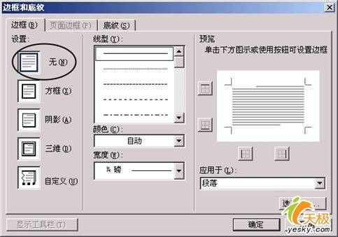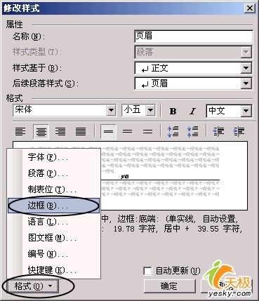 单击该对话框下端的“格式”按钮,选择“边框”,打开“边框与底纹”对话框。从边框设置中选择“无”,单击“确定”即可清除页眉横线,而页眉的其它格式不发生变化。