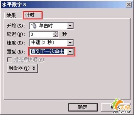 选择“计时”,从“重复”中选择“直到下一次单击”, 然后单击“确定”退出。再播放时,只要我们不点鼠标,蜜蜂就会一直跳下去了。