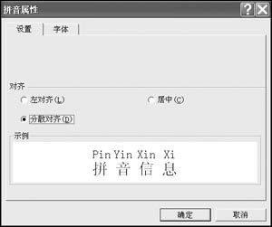 一般情况下,由于拼音缺省使用半角字符,而且又缺省使用左对齐模式,因此看起来不是那么美观。建议从“格式→拼音信息”菜单中打开“设置”对话框,这里不仅可以调整拼音的字体、字形、字号、下划线、颜色等格式,更妙的是还可以在“设置”选项卡中重新设置拼音与文字的对齐状态,例如左对齐、居中、分散对齐等,如图2所示,建议选择“分散对齐”,这样拼音与文字就可以一一对应了。