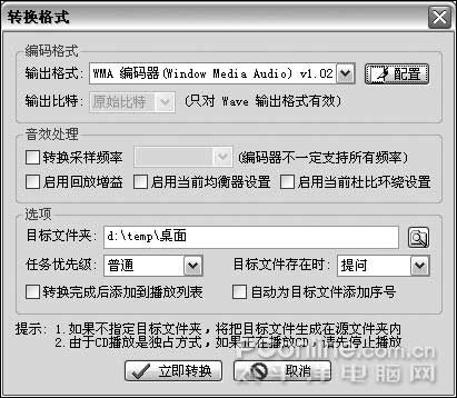 由于广播节目属于流媒体广播,其中大多数都是单纯的语音,即使播放音乐也无法与CD等介质的音乐质量相提并论。因此,除了在“选项”中的“目标文件夹”中指定好存放录制文件的目录,其他参数保持默认即可。最后点击“开始转换”按钮开始录制。