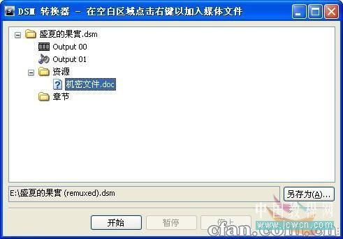 设置转换后文件的存储路径,最后点击“开始”按钮,即可创建对应的.DSM文件,这样,机密数据就包含在该.DSM文件中了,其他人是无法知道看起来好不起眼的.DSM文件中会竟藏有机密文件。当你需要从该.DSM文件中提取机密文件时,只需打开暴风影音的DSM转换窗口,在窗口空白处的点击右键,在弹出菜单中选择合适的.DSM文件,在打开的资源列表中展开“资源“项,在其中选中合适的机密文件,在其右键菜单上点击“另存为”项,即可将其单独导出了。