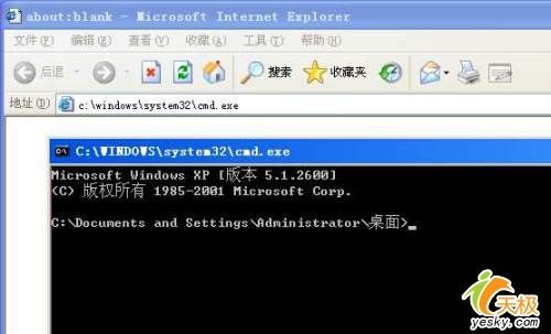 在IE地址栏中输入c:\windows\system32\cmd.exe回车,就能进入DOS窗口。(如图5)