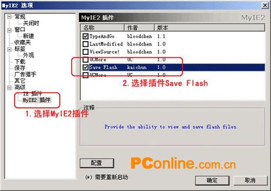 新版MyIE2 v0.60.750已经将插件包含在其中了,安装了MyIE2后,在菜单中找到“选项”→“MyIE2选项…”,在对话框中找到“高级”→“MyIE2插件”,会看到右边的列表框中罗列了MyIE2现有的插件。我们找到“Save Flash”并选中它。