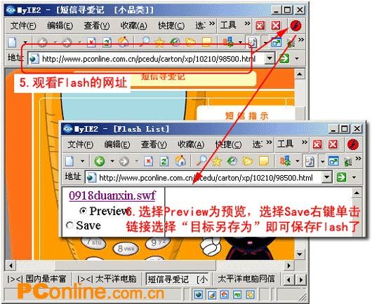 这时我们的MyIE2就配置好了,下面我们就来进行下载Flash文件的测试。我们打开PConline的“十大超级爆笑Flash小品欣赏”专题,找到要下载的“短信求爱记”,点击链接看到播放Flash的页面后,点击刚才添加的“Save Flash”插件按钮。