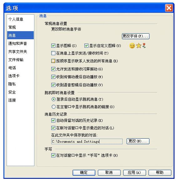 如果您选择了保存聊天记录,系统会默认将其保存在“我的文档”--“我接收到的文件”中。如果您要修改保存地址,请点击Messenger 菜单栏上的“工具”,选择“选项”,在打开的窗口中选择“消息”。点击“消息历史记录”旁的“更改”,可以修改保存“消息历史记录”的位置。